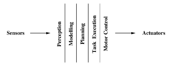 According to this paradigm, information was processed by a kind of pipeline, where sensor data was first processed by a Perception module, giving rise to a an internal model in the Modeling module. This model was used by a Planning Module, which would generate a plan. This plan would feed a Task Execution Module, which would generate control signals by a Motor Control Module, which would be sent to system actuators. Even though this operational cycle was adequate for small toy problem applications, Brooks pointed out the lack of scalability of such architecture. When the number of considered behaviors started to increase, the system complexity started to grow into many problems and the cycle started to become unfeasible.