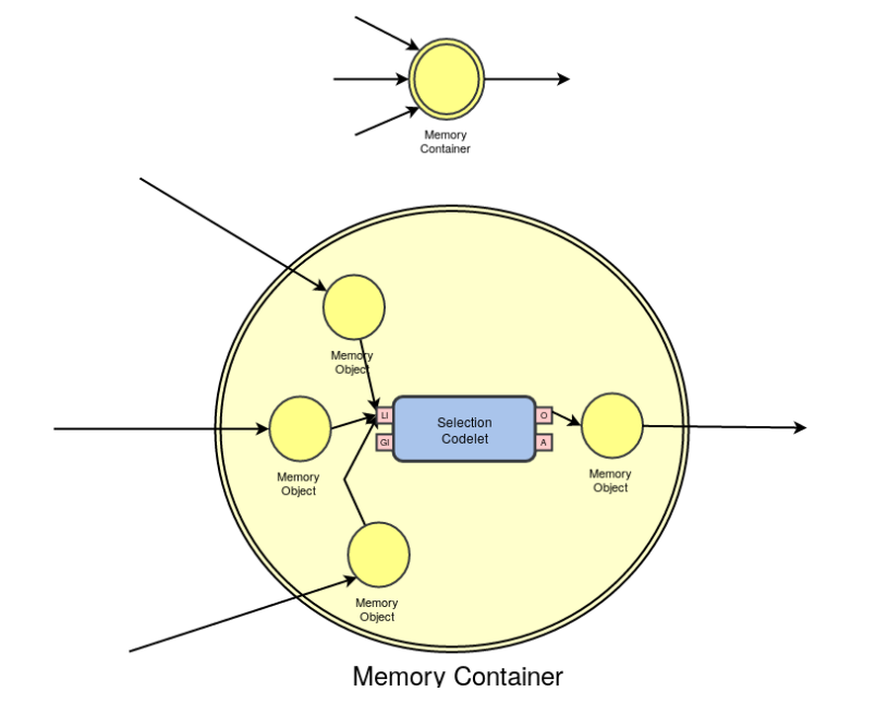 The Selection Codelet which is implicitly embedded into a MemoryContainer just selects the MemoryObject within the MemoryContainer which holds the maximum eval field, which can be set by the codelet which generated the MemoryObject. With the MemoryContainer mechanism, many different behavior codelets might write within the Container, but using its setI method, and while using the getI method to have access to its inner object, it will return the object with the highest eval value, which can be set with the setEval method.