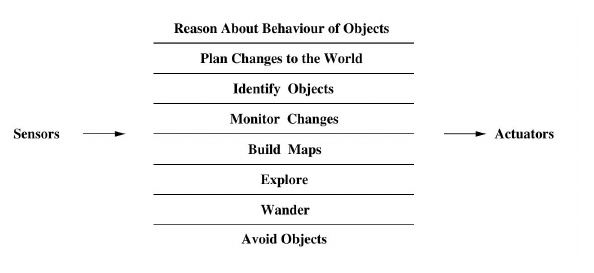 (Brooks 1986) Brooks, R. “A robust layered control system for a mobile robot”. In: IEEE journal on robotics and automation 2.1 (1986), pp. 14–23.
