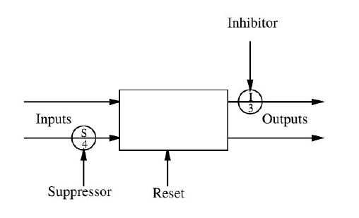 The inner workings of inhibitory and suppression nodes are very close to each other, but they are different. In both nodes, there are two inputs, and one of them is dominant over the second. The whole scheme is a message-passing scheme. An inhibitory node will receive a message at its dominant input, and this will cause the node to block, for a determined amount of time, any further messages arriving at the other input. The behavior of the suppression node is quite similar, but slightly different. A suppression node, in receiving a message at its dominant input, will block, for a specific amount of time, any further messages arriving at the other input. But, additionally to that, it will propagate the received message at the dominant input to its output.