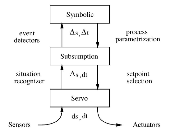 In the SSS (Servo-Subsumption-Symbolic) Architecture (Connell, 1992), a Subsumption Architecture is hybridized with a Symbolic rule-based interpreter in order to combine features from a conventional servo-system, with a Subsumption Architecture, with a rule-based symbolic AI system. This hybridization tries to integrate what is best in each kind of architecture. Servo-controllers have trouble with many real-world phenomena, which are difficult to be appropriately modeled within control theory models. Subsumption systems are more flexible to deal with these issues, but are also limited by the reactive paradigm. Event though they are able to generate very easily, quite complex kinds of behavior, they are not able to plan how to achieve future goals, and anticipate potential (and avoidable) hazards. This is basically what symbolic rule-based systems are able to provide.