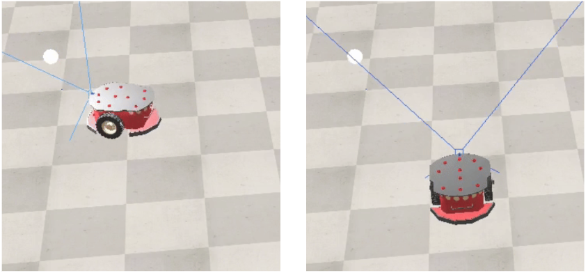 in CoppeliaSim itself and has two wheels, one right and one left. This robot will be our agent controlled by the cognitive architecture. We implemented it according to the architecture in above for each of the dependency rules between sensor information and the wheel speed of the vehicles 2 and 3 and were able to observe the expected behaviors. In the figure below, we can see two frames from the simulator of an agent demonstrating the passionate behavior of the vehicle. It approaches and stops, admiring the light point.
