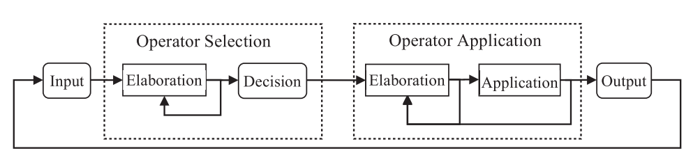 The SOAR processing cycle can be seen in figure below. For it to function, the system’s programmer/user must define a set of rules, and in the case of using an external simulator, handle the processing of input and output, which is the method of communication between SOAR and the external environment. We provide the environment's information through the Input, which is represented in the Working Memory (WM) by the input-link, and the result is provided through the Output, represented by the output-link.
