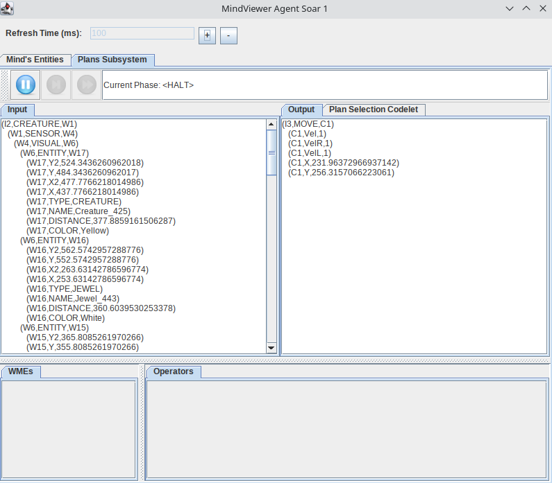 Some information about the JSoarCodelet, such as the input-link and output-link used, can be viewed through a specific tab in the MindViewer. To do this, it is necessary to register this codelet in the "Planning" group – it must be exactly this text, as that is how the MindViewer identifies whether there is a JSoarCodelet.